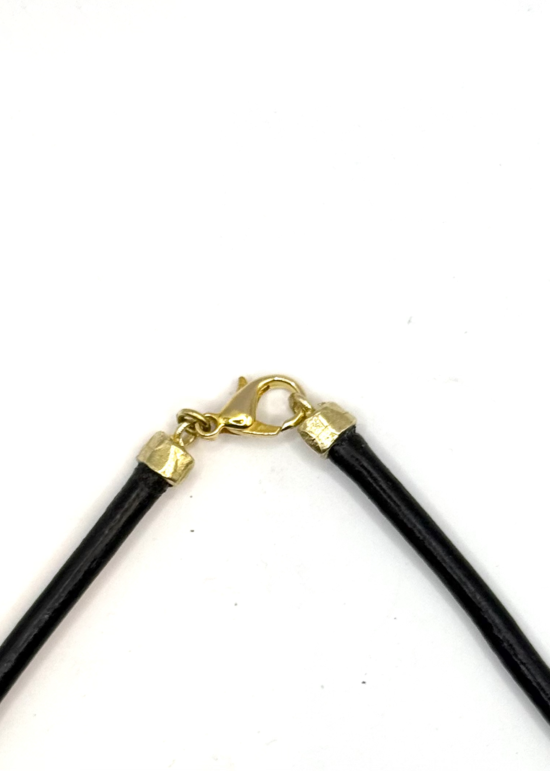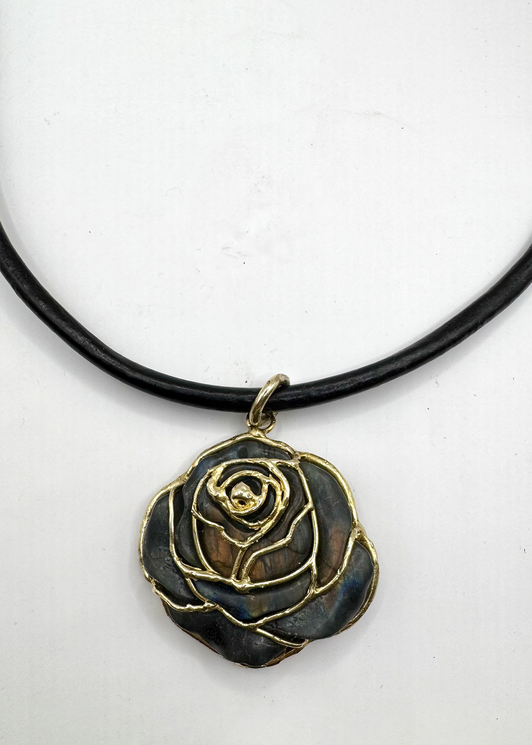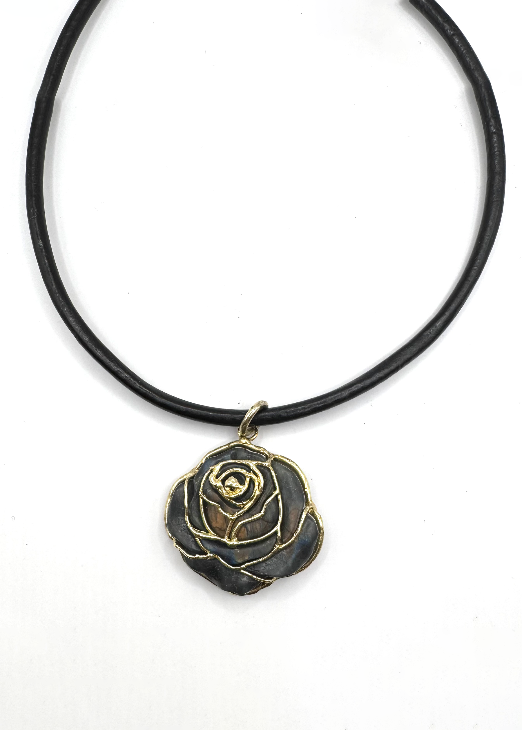 Ciondolo ROSELACE, rosa in labradorite e bronzo con cordoncino in cuoio